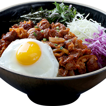 A rice bowl with thinly sliced beef